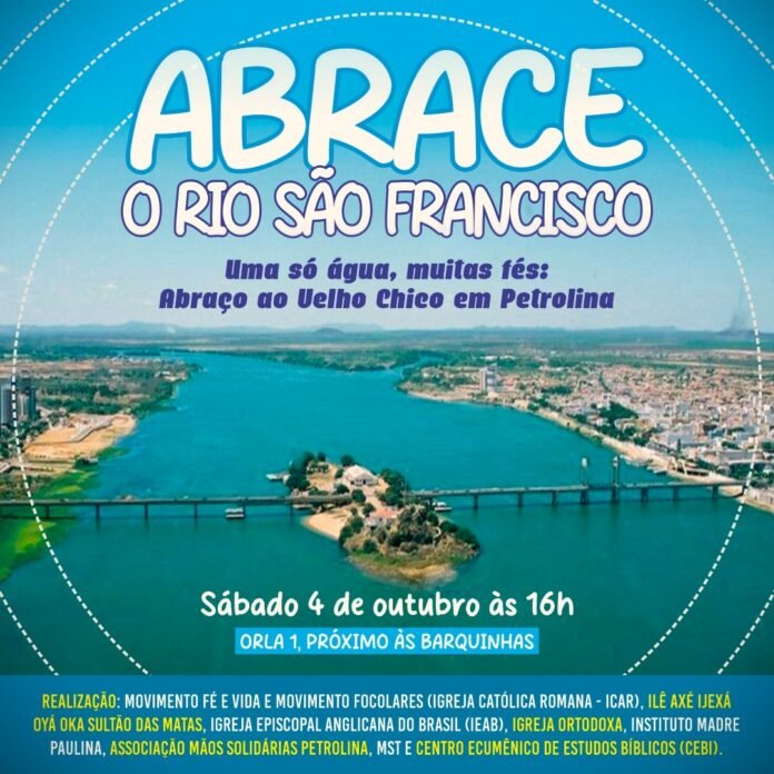 Unidas pela fé, diversas pessoas darão um ‘Abraço no Velho Chico’ no Dia de São Francisco, 4/10, em Petrolina, aniversário também do rio. O ato Interfé reunirá tradições religiosas afro, católica, anglicana, ortodoxa e ecumênica na Orla 1. O gesto antecede mobilização marcada para Juazeiro/BA dia 16/10, no Congresso Brasileiro de Agroecologia.