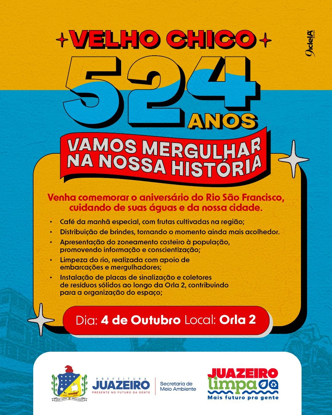 A Prefeitura de Juazeiro, por meio da Secretaria de Meio Ambiente/SEMA, preparou uma programação especial para comemorar os 524 anos do Rio São Francisco. O evento será realizado neste sábado (4), na Orla 2, reunindo atividades de celebração e preservação deste importante rio, que é fonte de vida para toda a região.
