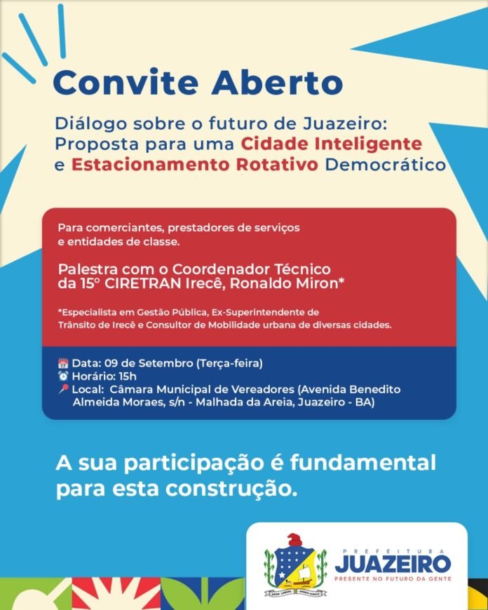 Nesta terça-feira (9), às 15 horas, a Prefeitura de Juazeiro vai apresentar a proposta de Cidade Inteligente, um projeto que visa modernizar o município através de um novo sistema de Estacionamento Rotativo Democrático.